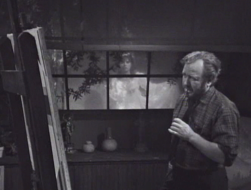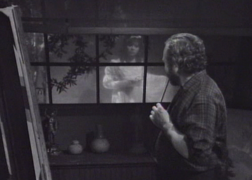 Then Maggie just walks right out of the Old House, which is an appalling lapse in the security protocol. The next thing we see, Sam’s at his house, working on the portrait — and Maggie is there, right outside his window!