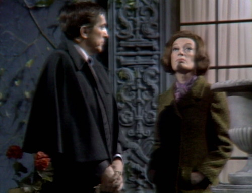 Speaking of clothing, it’s apparently warm enough for Vicki to stand outside in a light sleeveless dress but Casanova Collins is still wearing his inverness cape.