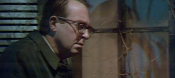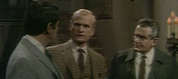 So here’s Dr. Woodard, leaving the Old House after a mutually threatening conversation with Barnabas. He bumps into Julia on his way out, and says good night. As soon as she enters the house, Woodard takes four steps over to the window, and helps himself to their conversation.