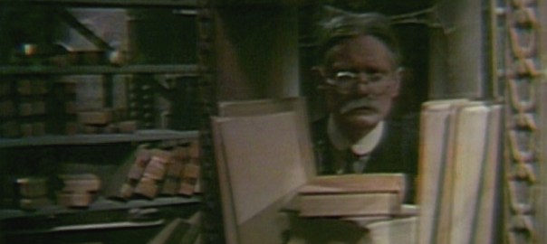 There’s an old man with glasses who’s carrying a book. He shuffles over to the wall with the gravestones, peers at them, and then looks at all of the other walls, as if he suspects they might be up to something. Then he shuffles over to the bookshelves, and puts down the book that he’s holding.