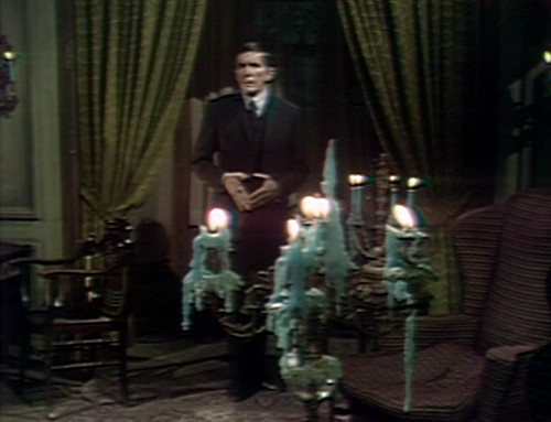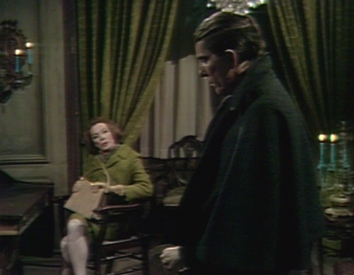 For the last few episodes, it’s mostly been Barnabas, Julia and Willie standing around in the Old House and discussing whether Barnabas should kill Maggie Evans or not. At the top of the show today, Barnabas has finally made a decision, and he’s on his way out the door — and there’s Julia on the doorstep, ready for another round of negotiations.