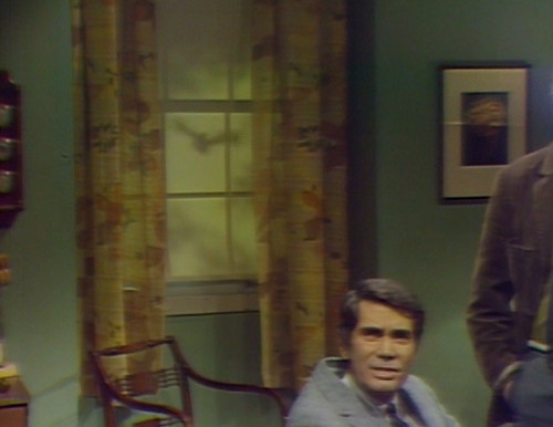 Anyway, focusing on the fashion is helping to take my mind off the dialogue. There’s nothing that’s particularly bad about it, but this is one of those episodes where people stand around speculating, and the audience is fully aware that they don’t have the essential information that they’d need to figure out whodunit.