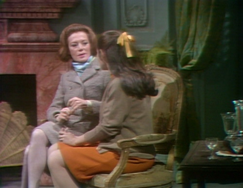 At the beginning of the episode, Vicki needs to get from the couch in the Collinwood drawing room set over to Josette’s room for the next shot. They do 20 seconds of establishing shots — the moon, the Old House exterior, the mirror — and she makes it in time.