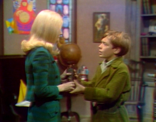The costume colors throughout this episode really rock! The yellow bedspread in Carolyn’s room, the green bathrobe of David’s, Liz’s burgundy dress, Carolyn’s lavender print nightgown and later teal dress: what an incredible palette of 1967 far out colors going on! The only thing that really needs to go is Julia’s hideous pale blue lab coat thingie she wears. My grandmother used to wear dust coats like that to clean her house but I don’t recall her ever performing “reverse polarity experiments.” She was pretty much straight-down-the-line Betty Crocker.
