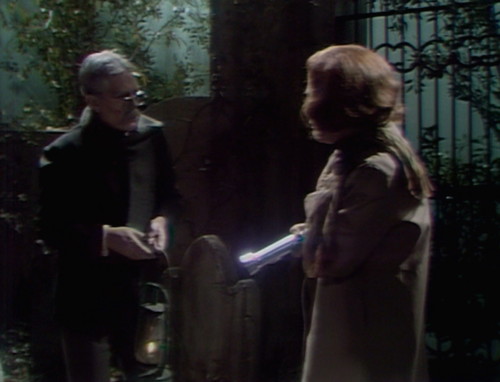 13. Jerry Lacey looked super-young and cute here; you wouldn’t guess he’d go on to play such unappealing reverends and such. Joel Crothers would have made a good Vulcan. The caretaker deserved to go, if for no other reason than he referred to people being “buried” in the mausoleum; if it’s a mausoleum, they aren’t buried–they’re interred! What kind of cemetery loiterer doesn’t know that? Don’t call us, we’ll call you.
