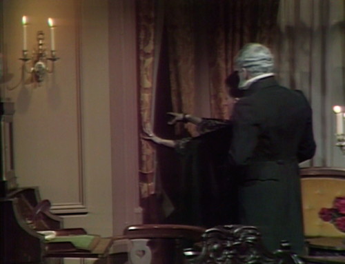 In the Collinwood foyer, when Joshua asks Natalie, “Is something wrong, madam?” a stagehand is seen moving across the bottom of the screen.