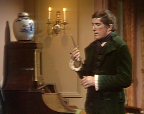 1. No, this isn’t the 1967 Barnabas portrait by Sam Evans. This is the same portrait that’s been hanging in the parlor since the beginning of the 1795 story line. The pose is similar, and admittedly the painting is rather obscured, but if you look at the 1967 Barnabas portrait closely, you’ll see that the hand positions are different. Here, the hand position is in the middle of the portrait, and in the 1967 portrait, the hands are more to the left (Barnabas’s right). As well, the 1967 Barnabas is wearing a long tie in the portrait, and this portrait seems to have a bow tie. (It really would make no sense that the set dressers would make such a huge mistake as to put the 1967 portrait there in the first place, and it would make even less sense to switch out the portrait for the wrong one in the middle of the story line.)