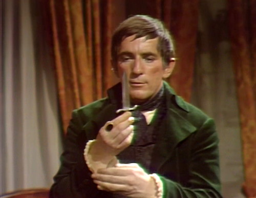 At one point, Barnabas actually runs his finger down the side of the blade to test it for sharpness, I suppose. We’ve seen how he handles guns in past episodes. I really think we need to keep any kind of weapon as far away from this actor as possible.