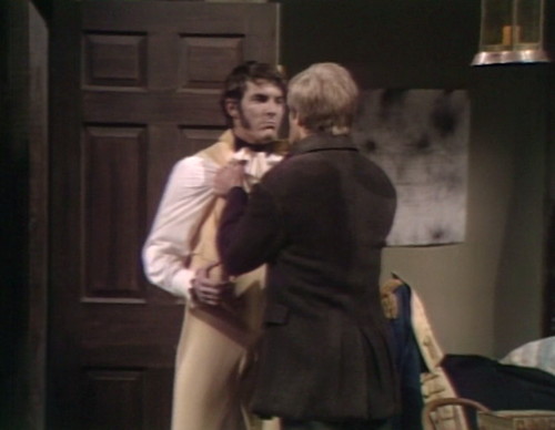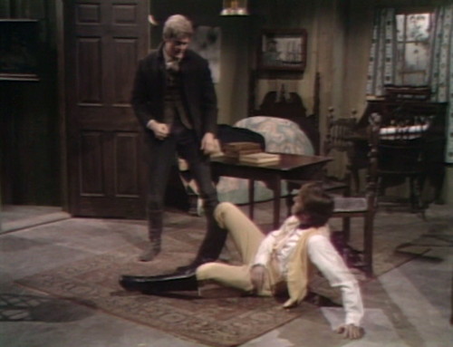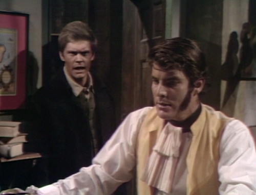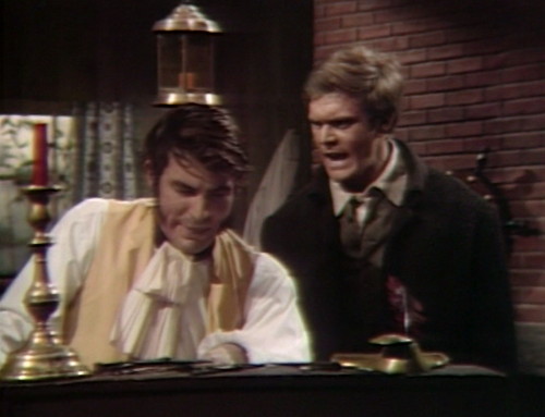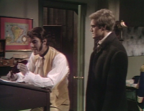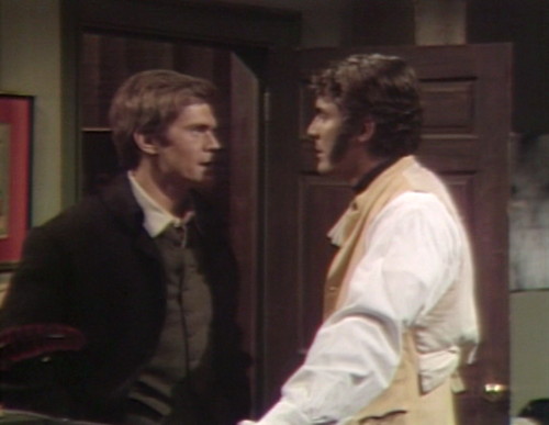 A note from resident prop-spotter Prisoner of the Night: Joshua’s office at the shipyard is a redress of a set that’s been used several times, including Roger’s office at the cannery, Barnabas’ first bedroom at the Old House and the interview room at the Collinsport Gaol. A couple of props have migrated from Barnabas’ old room: “The barometer is hanging between the two windows of the far wall. Above the fireplace, there’s a model ship mounted on the wall, a three-masted sailing ship with four sails on the main mast and two sails each on the foremast and mizzen mast (not to be confused with the model ship that rests on the mantlepiece of the Collinwood drawing room of the period, which also has three masts, but with five sails on each — the one that rests atop the armoire cupboard behind the sofa in the Collinwood drawing room of the late sixties. In Roger’s office and Barnabas’ first room, the main entrance was through the door at stage right, but in the Collinsport Gaol and Joshua’s office, the main entrance is through the door at stage left.” I keep telling you how amazing PotN is.