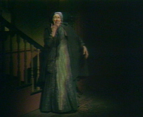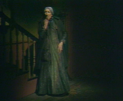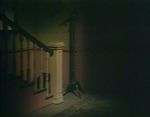 When Joshua leads Barnabas from the tower room, we see them entering the foyer through the small door under the landing. That’s usually the door that leads from the kitchen and servants’ quarters; getting to the tower room usually involves going up the stairs and using the door there. But to keep the plot moving, Millicent needs to be standing on the landing, where she sees Joshua and Barnabas leave. Maybe they took the scenic route.