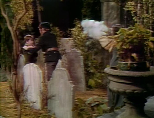 I liked that Craig S. apparently couldn’t be bothered to react in even the slightest way to the noise of Vicki’s shutting the mausoleum gate and then yelling at him. I liked also that he merely falls down in place when “shot,” demonstrating not the least bit of reaction to a bullet shot at close range and tearing through him. I wonder if the director’s inner thoughts were, “you bungling fool!”