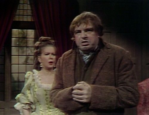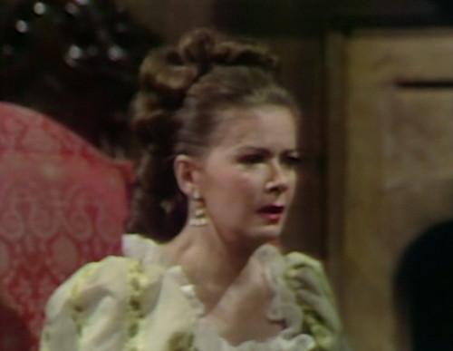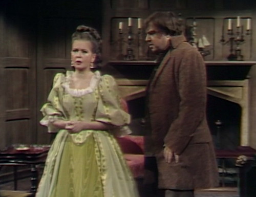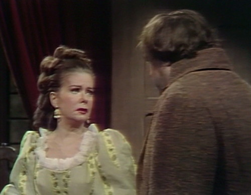 This is an unusual shot for Dark Shadows. You’ll see occasional moments when the camera will pull in on a character’s face, but only once in a while. In yesterday’s episode, for example, they did it twice. But going from a pan around the set to a long shot to a close-up with the same camera is rare. We’re going to see a lot of new camera moves today.