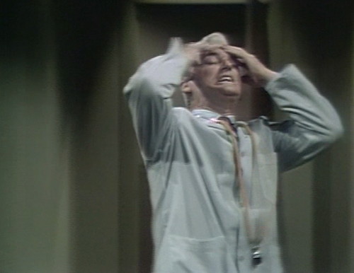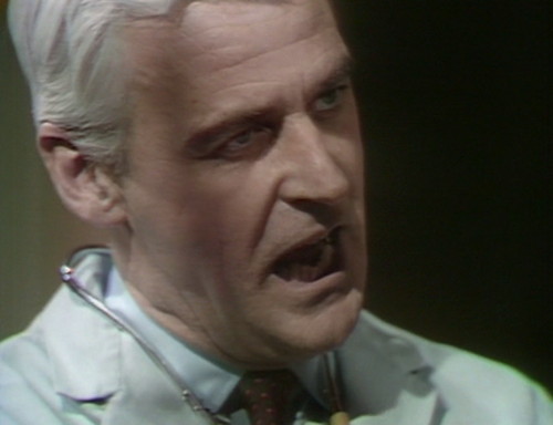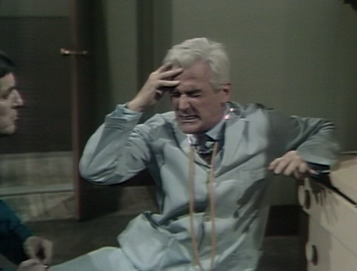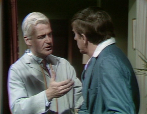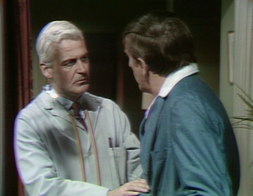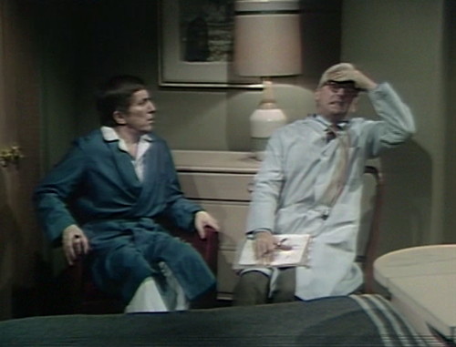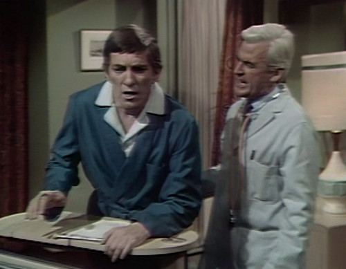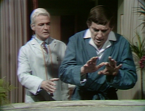 In the recap scene, Barnabas is wearing a different dressing gown. The dialogue is also cut down to speed up the scene, but it means that Lang’s line doesn’t really make sense: “Mr. Collins, I’ve been trying to tell you — I have given you many injections of new and experimental drugs.” At that point in the teaser, Barnabas has been conscious for three lines of dialogue. How hard have you been trying to tell him something?