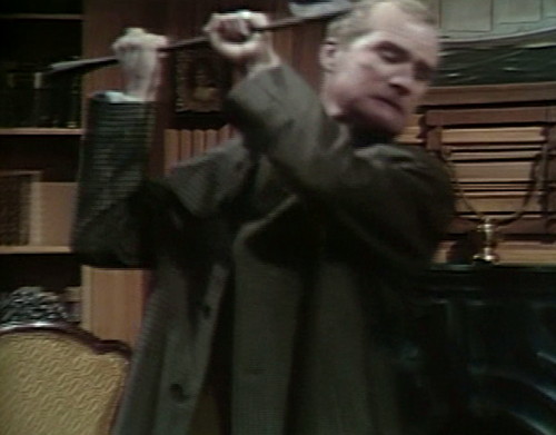And then — because this is Dark Shadows, and love is in the air — we get a sequence where a man tries to kill his doctor, wielding one of the doctor’s own harpoons.