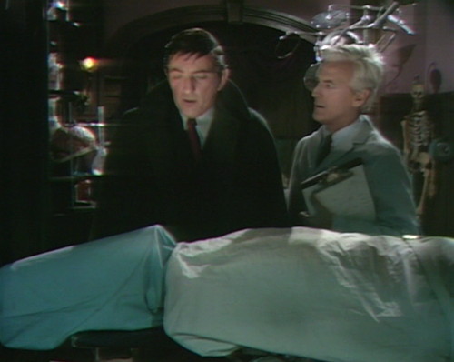 It is interesting to watch how the last scene of the previous episode, 475, is restaged for the opening scene of episode 476. On Friday, John Sedwick had Barnabas and Dr. Lang start their dialogue at the top of the stairs that lead down into the lab. Lela Swift, instead, begins with them standing on the floor of the lab proper. I think that Sedwick had more leisure to stage the scene, and both he and the audience knew that Lang and Barnabas were arriving from their previous location. Swift, on the other hand, probably had less time. In her version, the actors did not have to move as far across the set as they did on Friday. No bouncing down the stairs. Just start talking and then move a few feet to the gurney with Adam. Stinging musical note. Cue the pounding surf and main theme.