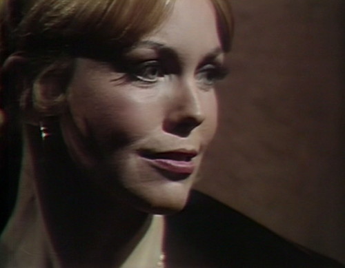 Then the doors open, and in wafts the ex-wife. Angelique is currently doing a tour of duty up at Collinwood, wearing a black wig and calling herself Cassandra, but this appears to be her night off.