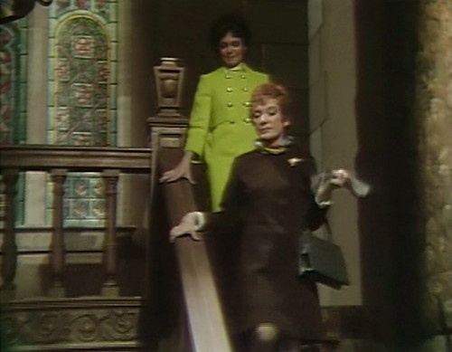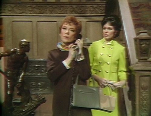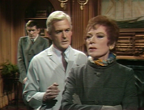 Cut to Collinwood, for another bewildering conversation. Angelique — the evil witch, who’s currently working undercover as Cassandra, Roger’s new wife — is heading out of the house with Julia.
