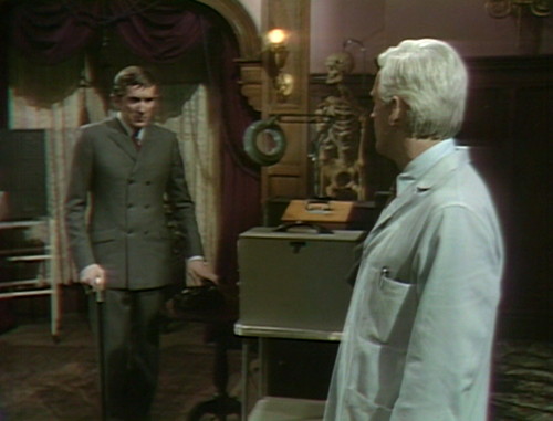 When Julia leaves the lab at the end of the episode, she goes into the parlor and locks the door. Lang and Barnabas are looking for her, and Lang tries the doorknob. He tells Barnabas, “It’s locked. She must be in there.” He listens for a few seconds, and then says again, “She must be in there!”