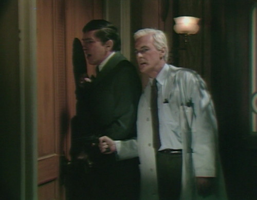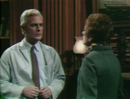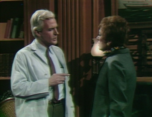 A thought about Julia: I think Grayson Hall is a fine actress. But I don’t think her characterization of Julia should include emotional storms. I didn’t find her reaction to Jeff’s impending decapitation credible. She’s a doctor and is presumably trained react rationally, even in the face of horror. She’s likely to be shocked by the situation, but not turned into a quivering mess. The problem was even worse in an episode that followed Woodard’s death. It’s been a while, but I recall her writhing around the set for the entire episode (interacting with the telephone, I think) and doing nothing but emoting. This doesn’t seem like the controlled Julia that we know. And frankly, I don’t think it plays to Hall’s strengths as an actress.