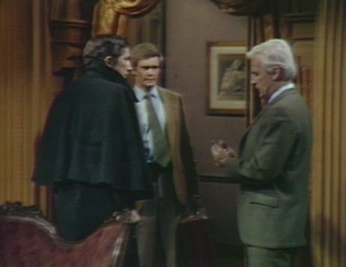 And the amazing thing is that everybody is still wearing a tie. Jeff says that it’s nearly dawn, and here they all are, hip-deep in neckwear. Jeff actually woke up and put on a tie, just to go downstairs and yell at Lang. We even saw Barnabas wearing a tie while he was relaxing at home in his purple dressing gown. Was it a rule in the 1960s that everybody on television had to wear a tie?