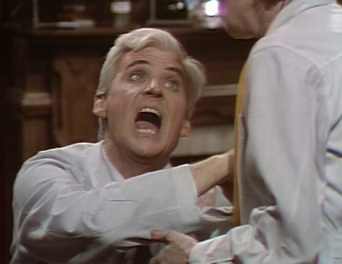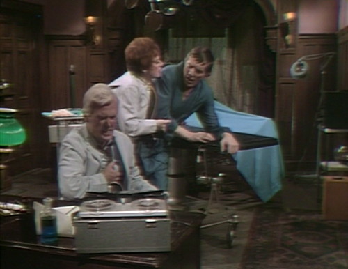 Addison Powell’s last moment as Dr. Lang — recording the taped message for Julia — is appropriately disaster-prone. He has trouble with the clunky controls on the reel-to-reel tape deck, and doesn’t turn it on in time for the sound effect of the music playing. Then he’s supposed to switch the prop recorder to “record”, which should still keep the reels spinning. Instead, he turns it off, and records his final words while the tape is clearly not running. The camera pulls in quickly when they realize how silly this looks. The dude can’t even die correctly.