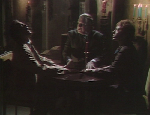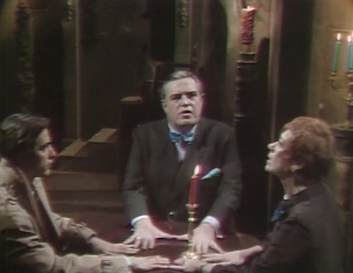 They’re messing around with a unique little quirk of Dark Shadows here — the fact that everyone in the cast played a different role during Vicki’s trip to 1795. Thayer David plays Professor Stokes as well as Barnabas’ servant Ben, and Jerry Lacy, who plays Tony, was also Reverend Trask.