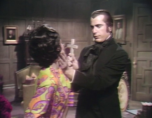 So that’s something new for Dark Shadows; I don’t think we’ve seen anything like this before. Reverend Trask, the hollering hypocrite, pulling a cross on a demon and making her beg for mercy. Who allowed that?