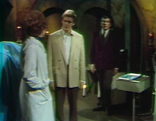 Today’s example involves Jeff Clark, former 18th century lawyer of no fixed abode, discovering the laboratory that Barnabas and Julia have set up in the Old House basement. Jeff spent a while working for mad Dr. Lang as they stitched Adam together, so he recognizes what’s going on, and he’s going to call the police and put a stop to it.