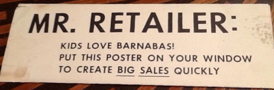 Retailers who ordered these boxes received bonus advertising material in each box, in the form of an 11″ x 36″ Barnabas display poster (also showing the card 1 pose) with the words “We have it!”, along with a note saying: “Mr. Retailer: Kids love Barnabas! Put this poster on your window to create big sales quickly.” These items are extremely rare, as they were unavailable to the general public.