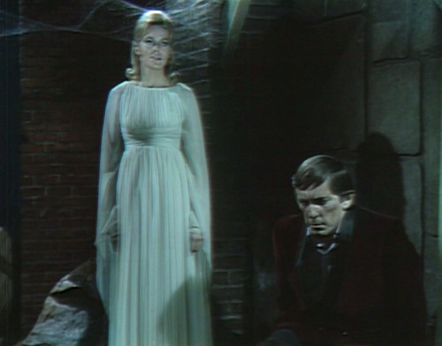 4. Isn’t there a blooper in the basement scene with Angelique and Barnabas? She appears to have said all she’s got to say to him, then goes up to the stairs to the door, appears to fiddle with the knob or lock a bit, then suddenly turns around, comes back down the stairs, and starts talking to Barnabas again. Then she disappears a la Chromakey. My DS-watching companion thought maybe she’d gone up the stairs to lock the door, but later Barnabus pushes the door open, easy as pie.