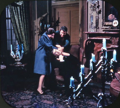 This was a long project for the View-Master people — the episodes represented here took place over about five weeks, so I imagine they must have come back regularly to set up the shots. They couldn’t have staged these specially for the photo shoot, because there are lots of different sets and costumes, and the Dark Shadows production is already living fairly close to the edge, just getting the show made every single day. They don’t have extra time to dress a bunch of sets just for View-Master.