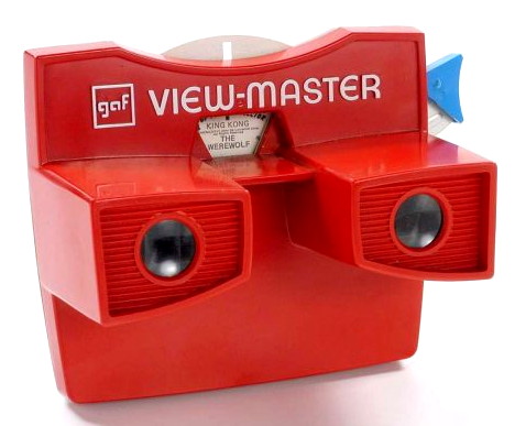 We didn’t have a View Master, we had a much older version. We had a rickety old thing made of metal and wood. You insert a card with two photos into a little wire rack on a strip of wood and then, as you look through the viewer with the little magnifying glasses, you could slide the images closer or farther away, for focus.