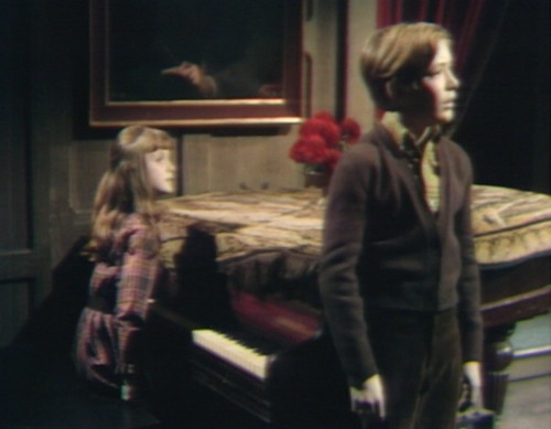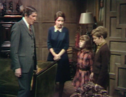 But here they come for round two. The kids walk downstairs to the drawing room, and ask Barnabas if they can go outside to play. David looks gloomy and withdrawn, which is appropriate after losing a beloved aunt.