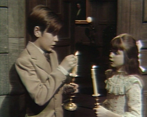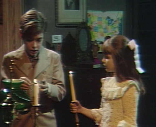 David and Amy are in the drawing room with candles, and they hear Carolyn in the foyer. David blows out his own candle, and then blows out Amy’s, but hers is already out. The two kids grin as they go on with the scene.