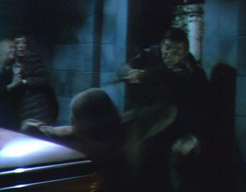 Alex Stevens is the best thing that ever happened to this show. Nancy Barrett sells her part as the hapless victim and more. Stevens really does drop perilously close to Barrett, just missing her by inches at the mausoleum entrance.