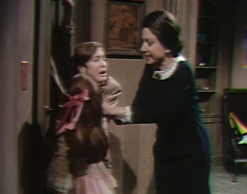 Liz tells them to go upstairs, and David yells, “I don’t want to go to my room alone!”, and Mrs. Johnson yells, “I’m not going anywhere with that man about!” But Liz insists, and the housekeeper leads the shrieking children away, and at that point, Liz can attend to the unconscious governess obstructing traffic on the carpet. The whole episode is like this.