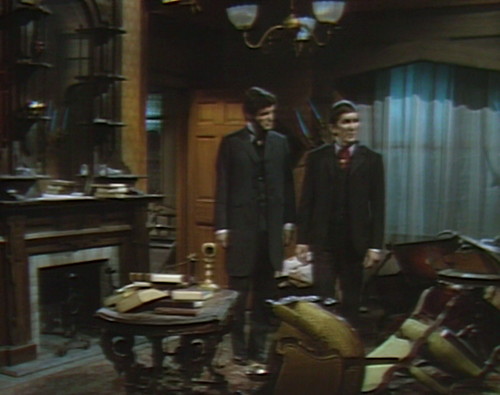 Now, technically, Barnabas already came in, but now he’s coming even more in. Quentin has two rooms now — the one that we’ve been thinking of as “the storage room” is Quentin’s front parlor, and this one I guess is supposed to be his sitting room, or something. My architectural vocabulary is not what it once was. The point is that Quentin has two front doors, which makes him twice as important as anybody else on the show.