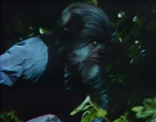As Jamison walks through the woods, he hears something moving around in the underbrush, and hurries away. The werewolf isn’t very far behind the boy, but even the remorseless savage killing machine can tell that there’s no point in pouncing on someone when we’re only halfway through act 2. So the werewolf just jumps up on a boulder and crouches there and looks awesome.
