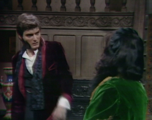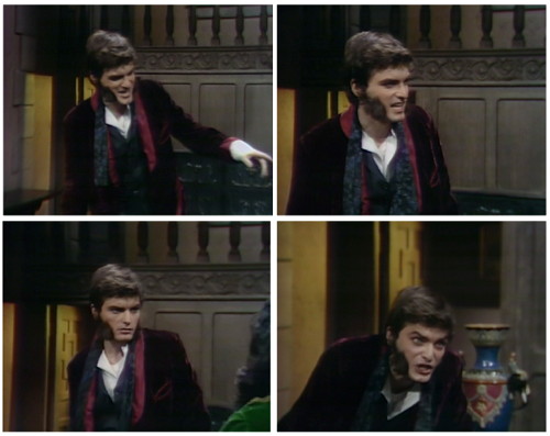 In fact, they open the scene with a close-up on Angelique, so that Quentin has a few seconds to hurry from the Collinwood set to the Old House set, and get into place by the time the camera pulls back. This is one of my favorite Dark Shadows late-60s soap opera tricks.