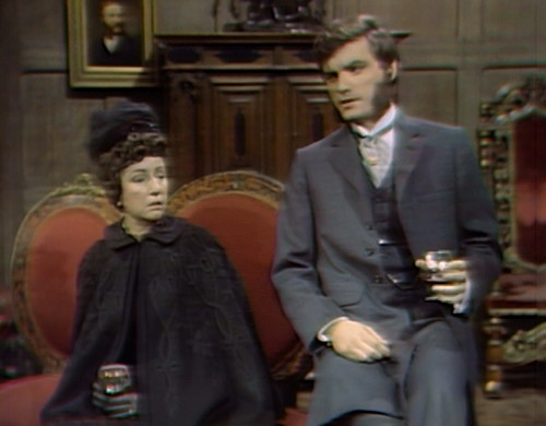 Minerva thought she’d find her husband at Collinwood — he’d told her he was headed this way — so she’s slightly put out to find neither Judith or the Reverend on the premises. Still, there’s the preserves to think of, so she settles on the settee, prepared to stay all night if she has to.