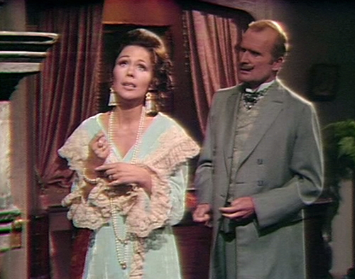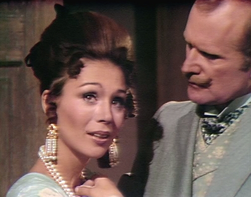 13. Great moment when the scene opens in Lady Hampshire’s room, before Edward comes in. She’s sitting by the fire. She opens her jaw slightly but keeps her lips closed. A gleam flickers in her eyes. That small facial gesture makes her look like a beast of prey, rather a lioness than a kitty. I wonder if Kathryn Leigh Scott came back from Africa thinking about big, dangerous cats. At any rate, it isn’t an expression that would ever have crossed the faces of Josette or of Rachel Drummond. It would have been possible for Maggie Evans only in those first couple of days, back when she was “everybody’s pal but no one’s friend.”