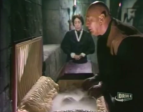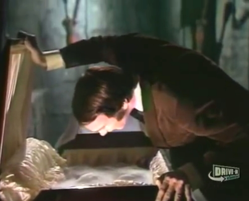 Then it’s over to the crypt again, where Jean-Paul has resumed being Jean-Paul. He opens up Erica’s coffin, and makes a speech about how the people from the Cryonics Institute are going to keep her flavor-sealed, until somebody figures out how to cure being dead. Jean-Paul seems worried about how long she’s going to last, so I don’t know why he’s standing there with the refrigerator door open. I mean, the thing he wants to do is already impossible, but even so, this seems counter-productive.