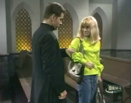 The problem is that her mother is evil, incessantly messing with her to get control of Dad’s money, and Matt helped her mother check Holly into Westley House, a sleepaway camp for the young and confused. Now she’s broken out of stir, and she’s come to this church just to indicate to Matt how pissed off she is. This is the correct behavior for a put-upon soap vixen in training.