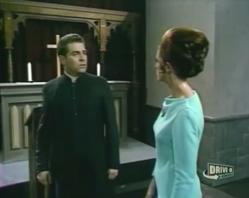 2. BTW, if memory serves from sometime in the early 70’s, “Secret Storm” ran a storyline about a Catholic priest in love with some woman (they milked the story, as any good soap would do back in the day), and it was so controversial that “Secret Storm” almost got yanked from the air. The whole story apparently had the Catholics up in arms, threatened boycotts, etc., and “Secret Storm” had to quickly retreat. Irna Phillips originally had a storyline on “Love Is A Many Splendored Thing” with a Catholic nun (Donna Mills) in love with some guy, and the network pressured her to backpedal on that one too. Very gutsy for even a Canadian syndicated soap to go there, Catholic priest in love, even in 1969! But maybe our SP priest is Episcopalian?