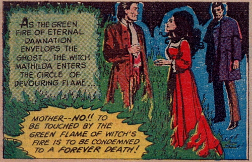 Mathilda strides into the conflagration, because as this story has proven, fire has absolutely no effect on anyone, ever. And Lucas throws a fit, screaming, “Mother — no!! To be touched by the green flame of witch’s fire is to be condemned to a forever death!”