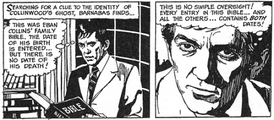 Following the trail of his strange foreboding, Barnabas heads to the archives, where he finds that there’s no date of death for Eban Collins. This book-keeping error stirs him up considerably, and he asks, “Can it be that Eban Collins did not experience a mortal’s death?” This doesn’t mean anything in particular.
