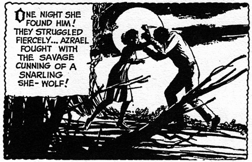 Then we’re introduced to Erik’s wife, Azrael Fabian, who’s the werewolf in this story. I’m telling you this because the writer is trying to pull some kind of Scooby-Doo maneuver, where you’re supposed to be thinking that the werewolf is Erik the whole time, and then it’s a huge shock when they announce that it’s actually Azrael, which you figured out two weeks earlier. I have no desire to participate in this transparent charade.