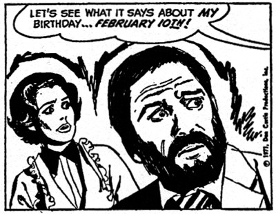 Now we’ve got a cast, more or less, so it’s time to get the story moving. Carolyn starts leafing through a book about horoscopes, and she casually mentions that her birthday is February 10th, which appears to shock the Fabians out of a year’s growth.