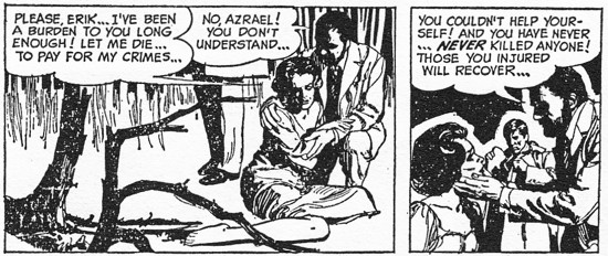 Once they manage to dribble some blood spatter on Azrael, she turns back into a human being, more or less. She feels terrible about the whole thing, but Erik reassures her by telling her, “You couldn’t help yourself! And you have never… never killed anyone! Those you injured will recover…”