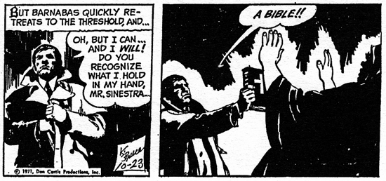 So then you end up with one of the weirdest things to ever happen in a Dark Shadows story — Barnabas reaching into his coat, and saying, “Do you recognize what I hold in my hand, Mr. Sinestra… A BIBLE!!“